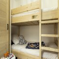 Inside, the apartment boasts a generous living area designed for relaxation and connection. The dining room, complete with a TV, flows seamlessly into a fully equipped kitchen featuring an oven, microwave, dishwasher, refrigerator, and induction hob. The sleeping arrangements are thoughtfully designed, with a cozy bedroom featuring a double bed and private shower room, a cabin with bunk beds and its own shower room, and a sofa bed available upon request. A separate bathroom and toilet ensure convenience for all guests. The 13m² terrace, facing southwest, provides breathtaking views of the slopes, perfect for unwinding after a day of adventure.