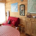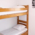 Inside, the apartment comfortably accommodates up to six guests. The bedroom features two bunk beds that can be joined, while a mountain corner mezzanine bed and a sofa bed in the living room offer additional sleeping options. The living area is equipped with a TV, DVD player, and radio, creating a cozy space to unwind after a day of activities. The kitchen is fully equipped with an oven, ceramic hob, dishwasher, and refrigerator, ensuring you have everything you need to prepare delicious meals. A modern bathroom with a shower and a separate WC add to the comfort and practicality of the space.