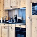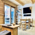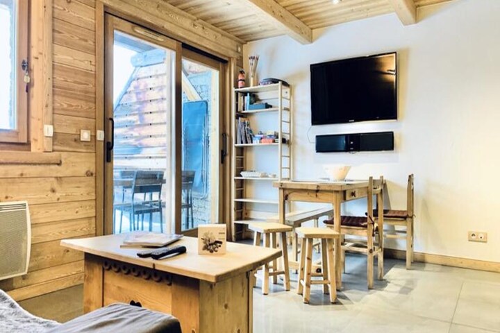 Inside, the apartment combines modern comfort with alpine charm. The cozy living room is perfect for unwinding after a day on the slopes, while the fully equipped kitchen makes preparing meals a delight. The sleeping arrangements are thoughtfully designed, featuring a master bedroom with a double bed and a second TV, a cabin room with a double bed and a single bunk above, and a sleeping alcove with bunk beds. A spacious bathroom with a bathtub ensures relaxation, and the private terrace, bathed in sunlight, is ideal for soaking in the mountain air. Additional amenities include a flat-screen TV, raclette and fondue sets, and a secure garage with an electric charging station.