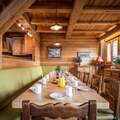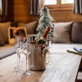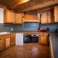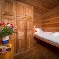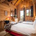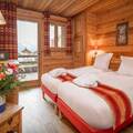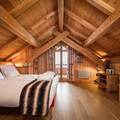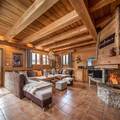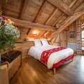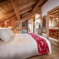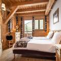 The interior of the chalet is lovingly designed, with stone and wooden walls in keeping with classic alpine architecture, as well as high vaulted ceilings. Spread over 4 floors, the chalet has 7 bedrooms, each with en-suite bathrooms and direct access to a balcony. The kitchen is located next to the open plan living and dining area, with a large stone fireplace as the focal point of the room. The fireplace is surrounded by a large corner sofa, which provides a cosy place to relax watching TV or playing cards with family or friends. In the dining area there is a beautiful solid wood table where all guests can sit.