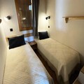 Composition of the living room: 1 sofa bed (sleeps 2). 1 cabin area: 2 single bunk beds. Dining area: 1 table with 1 bench, 3 chairs and 1 stool.