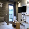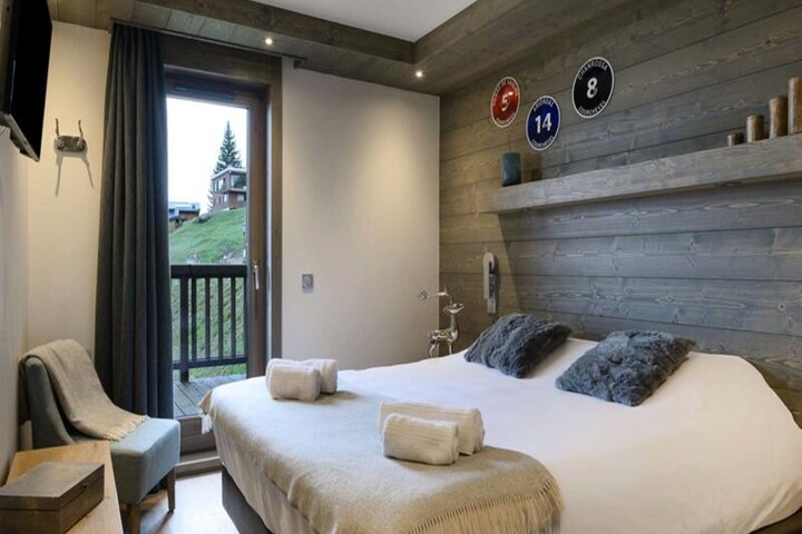 In the heart of Courchevel Moriond, where alpine charm meets modern luxury, this elegant apartment offers a serene escape for families and couples alike. Imagine waking up to breathtaking views of the valley and surrounding peaks, stepping out onto your private balcony to sip your morning coffee as the crisp mountain air fills your lungs. Just moments from the resort center and ski slopes, this property is perfectly positioned for both adventure and relaxation. \n\nSpanning 42m², the apartment is thoughtfully designed to accommodate two adults and two children. The cozy living room, complete with a dining area and smart TV, opens onto a balcony furnished with a coffee table and chairs—ideal for unwinding after a day on the slopes. The fully equipped kitchen, featuring a Nespresso machine, oven, dishwasher, and more, ensures you have everything needed to prepare delicious meals. The master bedroom offers flexibility with a double or twin bed setup, a wardrobe, and a safe, while the charming cabin with bunk beds provides a cozy retreat for children. A sleek bathroom with a walk-in shower and premium toiletries completes the space. \n\nConvenience is key here, with Wi-Fi, a ski locker with a boot dryer, and a parking space in the residence's garage included. Accessing the slopes is effortless thanks to an escalator located directly opposite the residence, connecting you to the vibrant resort center and ski lifts. \n\nWhether you're here to carve through pristine snow, explore the lively après-ski scene, or simply soak in the tranquil alpine ambiance, this apartment offers the perfect base for an unforgettable mountain getaway. Let Courchevel Moriond enchant you with its blend of natural beauty and world-class amenities.