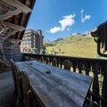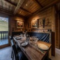 Spanning 120m², the apartment comfortably accommodates up to six guests across its thoughtfully designed spaces. The ground floor features a cozy living and dining area complete with a fireplace and television, perfect for unwinding after a day on the slopes. The separate, fully equipped kitchen includes modern appliances such as a Nespresso machine and washer-dryer, ensuring all the comforts of home. The double bedroom on this level opens onto a terrace, where two sun loungers and a dining table invite you to soak in the breathtaking views. Upstairs, you’ll find a spacious double bedroom, a charming sleeping alcove with bunk beds, and a luxurious bathroom with a shower, bathtub, and double vanity. Ample storage and high-end amenities complete the experience.