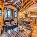Spanning 105m², the apartment seamlessly blends warmth and sophistication. The spacious living room, complete with a cozy lounge and dining area, invites you to unwind after a day of adventure. The fully equipped open-plan kitchen, featuring modern appliances like a Nespresso machine, wine cooler, and dishwasher, ensures every meal is a delight. Three beautifully appointed bedrooms provide restful retreats, including a master suite with a whirlpool bath and private balcony. Additional amenities such as Wi-Fi, a ski locker with a boot dryer, and a safe add to the convenience and comfort of your stay.