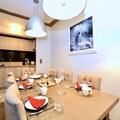 Inside the apartment, you’ll find a spacious kitchen, fully equipped to prepare your favorite meals. The open-plan design leads into a warm dining area, perfect for enjoying meals with your loved ones. The large living room offers a comfortable space to unwind, while the private balcony provides stunning mountain views. Guests also have access to the fitness room and spa, enhancing their stay.