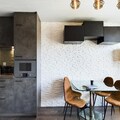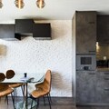 The apartment features an open kitchen fully equipped for self-catering, and the spacious living room with a corner sofa opens onto the large balcony. The bathroom includes separate WC facilities for added convenience, ensuring a comfortable and enjoyable stay for guests.