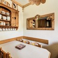 The apartment features an American-style kitchen equipped with a refrigerator, microwave, and a six-seat dining area. The bathroom includes a shower, electric towel dryer, and ample storage space. Additional amenities include a separate toilet, a power outlet near the mirror, and a balcony with mountain views. Wi-Fi access is available for an additional charge, and bed linen, towels, and end-of-stay cleaning are available at extra costs. Covered parking is available upon request.