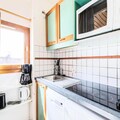 Inside, the apartment features a semi-open kitchen area with essential appliances, although it lacks a separate dining area. The living space is bright and functional, with a dining table and chairs for added comfort. The property also includes a private bathroom with a water closet and a balcony to enjoy the views. Bed linen and towels are available for an extra charge, and end-of-stay cleaning is mandatory.