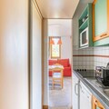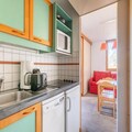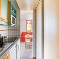 The studio features a semi-open kitchen, providing guests with basic cooking facilities. The kitchen area is compact, with no separate dining table, but the living space includes a dining table with seating for four. The private bathroom is in good condition, and the apartment is bright and comfortable. For those requiring additional services, bed linens, towels, and cleaning can be arranged at extra cost, ensuring a convenient stay.