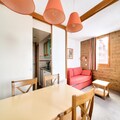 At the foot of the slopes, the apartment provides direct ski-in/ski-out access, ideal for winter sports lovers. The village center, just a short walk away, features shops, cafes, and markets. Guests can enjoy local Savoyard cuisine at nearby restaurants, including the K2, which is conveniently located close by. This location is perfect for outdoor activities and relaxation.