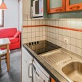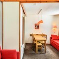 The apartment features a semi-open kitchen for preparing meals, along with a dining table for four. The living area is bright and welcoming, with a cozy atmosphere. The balcony offers a southern exposure and a pleasant space to enjoy the outdoors. For additional comfort, bed linens, towels, and end-of-stay cleaning services are available for an extra charge, ensuring flexibility throughout your stay.