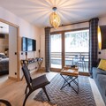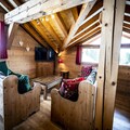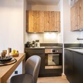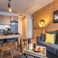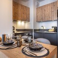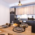 The apartment features a fully equipped kitchen, allowing guests to prepare meals in comfort. The living area blends modern style with alpine décor, creating a welcoming atmosphere. Additional amenities include a cozy dining area and access to the residence’s communal lounge and bar, where guests can enjoy premium services such as gourmet snacks, hearty breakfasts, and a convivial evening setting. This property provides a unique and comfortable mountain retreat with a focus on relaxation, convenience, and memorable alpine experiences.