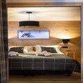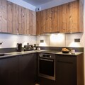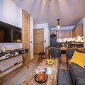 The modern open kitchen is fully equipped with a ceramic hob, microwave, dishwasher, fridge, coffee machine, toaster, and kettle. A second kitchenette with an espresso machine provides extra convenience. The apartment includes one bedroom with a double bed and a cozy cabin room with bunk beds, ideal for children. Two bathrooms with showers and toilets ensure comfort and privacy for everyone.