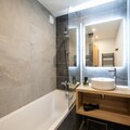 Living room(double sofa bed(160 x 190 cm), TV(flatscreen), seating area), open kitchen(hob(ceramic), electric kettle, toaster, coffee machine, microwave, dishwasher, fridge, dishes and cutlery), Kitchenette(electric kettle, toaster, espresso machine, microwave, fridge, dishes and cutlery), bedroom(double bed(160 x 200 cm)), Cabin(bunk bed(80 x 190 cm)), bathroom(shower, toilet), bathroom(shower, toilet), terrace