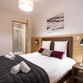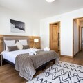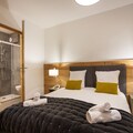 Living room(double sofa bed, TV(flatscreen), seating area), open kitchen(hob(ceramic), electric kettle, toaster, coffee machine, oven, microwave, dishwasher, dishes and cutlery), Bedroom with bathroom(double bed(160 x 200 cm), shower, toilet), Bedroom with bathroom(single bed(90 x 200 cm), single bed(90 x 200 cm)), Bedroom with bathroom(single bed(90 x 200 cm), single bed(90 x 200 cm)), bathroom(shower), toilet(toilet), washing machine, balcony, Mountain view