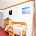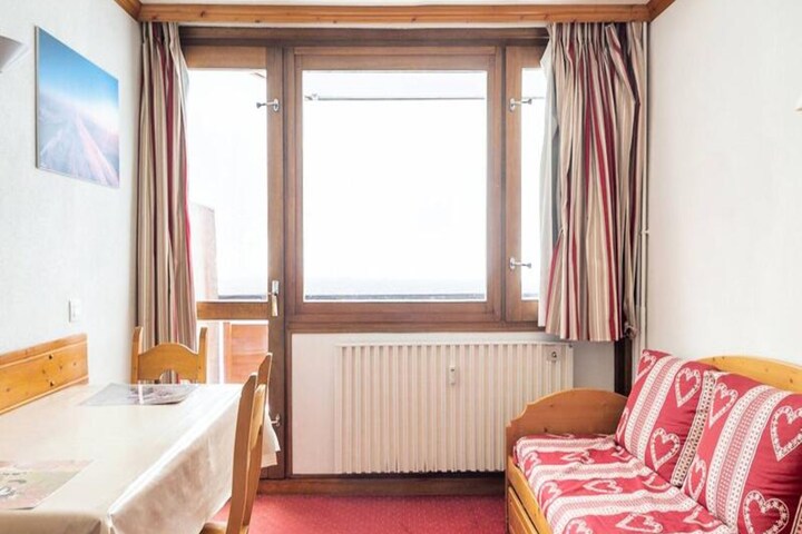 High above the snowy slopes of Plagne Centre, this charming studio invites you to experience the magic of the French Alps in every season. Wake up to breathtaking views of the pistes from your south-facing balcony, where the crisp mountain air sets the tone for a day of adventure. Whether you’re here for skiing, snowboarding, or simply soaking in the alpine atmosphere, this cozy retreat offers the perfect base for your holiday. Located on the 7th floor with elevator access, it combines convenience with stunning panoramas. \n\nInside, the studio is thoughtfully designed to accommodate up to three guests. The living area features two single trundle beds and an additional single bed, ensuring restful nights after active days. A compact kitchen equipped with electric hobs, a combination oven, dishwasher, and refrigerator makes meal preparation a breeze, while the dining area provides a welcoming space to gather. The bathroom includes a bathtub and integrated toilet, adding to the comfort of this well-appointed space. \n\nSituated at the foot of the slopes, the residence connects directly to shops via a gallery, making it easy to access everything you need. A ski locker is conveniently located on level 1, ensuring hassle-free storage for your gear. Outdoor parking nearby adds to the practicality of this location. With the pistes just steps away, you can enjoy effortless access to world-class skiing and snowboarding in the Paradiski domain. \n\nWhether you’re seeking thrilling winter sports or tranquil summer hikes, this studio offers an unbeatable combination of comfort, location, and alpine charm. Create unforgettable memories in the heart of the French Alps, where every moment is framed by the beauty of the mountains.