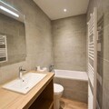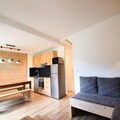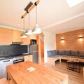 Designed to accommodate up to nine guests, the apartment spans two levels and combines comfort with functionality. The first floor features a fully equipped kitchen with modern appliances, a cozy living room with a dining area, and a corner sofa that converts into two single beds. Upstairs, you'll find three bedrooms, including a master bedroom with a double bed, a cabin room with bunk beds and a single bed, and a twin room. Two bathrooms—one with a shower and the other with a bathtub—ensure convenience for larger groups. Additional amenities like a washing machine, multiple TVs, and a ski locker add to the ease of your stay.