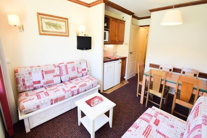 High above the stunning Tarentaise Valley, this charming apartment in Residence Le Mont-Soleil B invites you to experience the magic of the French Alps. With its south-facing balcony offering panoramic views of the slopes and mountains, every moment here feels like a postcard come to life. Whether you're watching the sunrise paint the peaks in golden hues or gazing at the stars over snow-covered landscapes, this is a retreat that blends alpine beauty with cozy comfort. Perfectly located in the heart of the ski area, you'll find yourself immersed in the thrill of Paradiski’s world-class slopes just steps away. \n\nDesigned for up to five guests, the apartment features a thoughtfully arranged layout with a warm and inviting living space. The kitchenette is equipped with modern amenities including electric hobs, a refrigerator, microwave, dishwasher, and both a filter coffee maker and Nespresso machine—ideal for preparing hearty meals or quick snacks before heading out. The living room offers a dining area, two pull-out beds, and a single sofa bed, while the separate bedroom boasts a plush double bed for restful nights. A bathroom with a bathtub and a separate WC add convenience, while the ski locker at slope level ensures effortless access to your alpine adventures.\n\nBeyond the apartment, the vibrant Plagne Soleil area offers a blend of tranquility and excitement. From ski schools and rental shops to charming eateries serving Savoyard specialties, everything you need is within easy reach. In summer, the region transforms into a paradise for hikers and mountain bikers, with trails weaving through lush meadows and breathtaking vistas. Whether you're here for winter sports or summer exploration, this residence is your gateway to unforgettable moments in the Alps.\n\nMake this your home away from home and discover why the French Alps are a destination that captivates travelers year-round.
