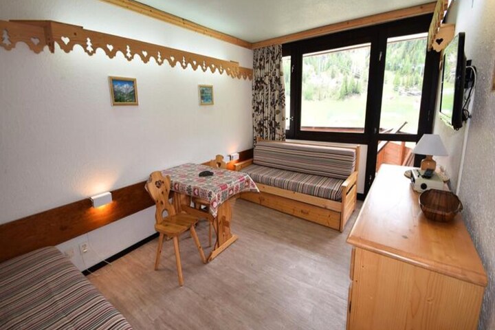 High above the bustling heart of Plagne Centre, this cozy studio offers a front-row seat to the slopes and an unbeatable alpine experience. Imagine waking up to the sunlit panorama of snow-covered peaks and stepping onto your private balcony to breathe in the crisp mountain air. Located on the 8th floor of the Residence Le France, this bright and renovated space is perfect for couples or small groups seeking a serene yet adventurous getaway in the iconic Paradiski domain. \n\nThe studio is thoughtfully designed to maximize comfort and functionality within its 22m² layout. The kitchen, conveniently situated in the hallway, is equipped with ceramic hobs, a refrigerator, dishwasher, and multifunction oven, making it easy to prepare hearty meals after a day on the slopes. The living area features a dining space, two pull-out beds, and a single bed, ensuring restful nights for up to three guests. Modern amenities like a television and a south-facing balcony with breathtaking views of the slopes and surrounding mountains add to the charm of this alpine retreat. \n\nStep outside and find yourself directly at the foot of the slopes, with ski lockers on the ground floor for added convenience. The residence is connected to shops and services via a gallery, making it effortless to access dining, shopping, and après-ski activities. Outdoor parking is available nearby, and the location is ideal for exploring the vibrant village atmosphere of Plagne Centre. \n\nWhether you're here for skiing, snowboarding, or simply soaking in the beauty of the French Alps, this studio offers the perfect balance of comfort, convenience, and stunning views. Plan your escape to Residence Le France and create unforgettable memories in the heart of Paradiski.