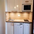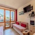 Inside, the apartment offers a warm and functional layout. The bedroom features a comfortable double bed, while the living room is equipped with two single beds and a TV for relaxing evenings. The kitchen is fully equipped with modern appliances, including a dishwasher, microwave, ceramic hobs, and even a raclette set for a true taste of the region. The bathroom is thoughtfully designed, and the apartment is complete with duvets for a cozy stay. A ski locker is conveniently located in the building, and pets are welcome for a small fee, ensuring the whole family can join the adventure.