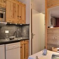 The studio, located on the second floor of a seven-story residence with an elevator, is thoughtfully designed to accommodate up to four guests. The living room features a comfortable double sofa bed and a flat-screen TV, while the separate sleeping area includes cozy bunk beds by a window. The compact yet well-equipped kitchen boasts a combination microwave, dishwasher, ceramic hob, and refrigerator, ensuring you have everything needed for a home-cooked meal. After a day of exploration, unwind in the bathroom with a relaxing bathtub. The residence also offers individual ski lockers and paid underground parking with direct access for added convenience.