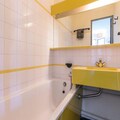 Inside, the 35m² apartment is thoughtfully designed to accommodate up to six guests. The fully equipped kitchenette, complete with a ceramic hob, dishwasher, microwave, coffee maker, and kettle, makes meal preparation a breeze. The cozy bedroom features a double bed, while a separate sleeping alcove with bunk beds and a double sofa bed in the living room provide flexible sleeping arrangements. A bathroom with a bathtub and a separate toilet add to the convenience, and a flat-screen TV ensures entertainment after a day of exploring.