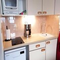 The apartment includes a kitchenette equipped with a refrigerator, a microwave/grill combination, electric hobs, a coffee maker, a toaster, and a kettle; it opens onto the living room with a table, a sofa, and a flat-screen TV.