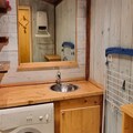 The 35m² apartment, rated 3 Paradiski Crystals and 3 Stars, comfortably accommodates 5-6 guests. Its inviting layout includes a cozy living room with a single sofa bed and trundle bed, a bedroom with a double bed and TV, and a sleeping alcove with bunk beds. The open kitchen is fully equipped with modern appliances, including a mini oven, microwave, ceramic hobs, and a dishwasher, making it easy to prepare meals after a day of adventure. A large balcony provides breathtaking views of Mont Blanc, perfect for unwinding with a warm drink in hand. Additional amenities such as a flat-screen TV, DVD player, washing machine, and stereo system ensure a comfortable and enjoyable stay.