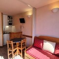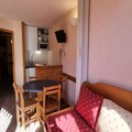 High above the Tarentaise Valley, where the crisp alpine air invigorates the senses, the Chamois Column studio offers a charming retreat within the iconic Paquebot des Neiges residence. This unique architectural gem, reminiscent of a cruise ship, is perfectly positioned for ski enthusiasts, with direct ski-in/ski-out access to the slopes and breathtaking views from its south-facing balcony. Whether you're here to carve through pristine snow or simply soak in the serene mountain atmosphere, this studio promises an unforgettable escape. \n\nDesigned for comfort and practicality, the 26m² studio accommodates up to four guests. The living area features two single sofa beds, a trundle bed, and a fold-down bed, ensuring flexible sleeping arrangements for families or small groups. A flat-screen TV provides entertainment after a day of adventure, while the open kitchen is equipped with a microwave, refrigerator, dishwasher, and electric burners, making meal preparation a breeze. The bathroom includes a bathtub for a relaxing soak, and the separate toilet adds convenience to your stay. \n\nThe Paquebot des Neiges residence boasts excellent amenities, including free outdoor parking, paid covered parking, and shops conveniently located on level G. A ski locker ensures hassle-free storage, and a free resort shuttle on the ground floor makes exploring the area effortless. For added comfort, linens, end-of-stay cleaning, and Wi-Fi access are available at an additional cost. \n\nWhether you're drawn to the thrill of the slopes or the tranquility of the mountains, the Chamois Column studio is your gateway to the beauty and adventure of the French Alps. Create lasting memories in this cozy retreat, where every detail is designed to enhance your alpine experience.