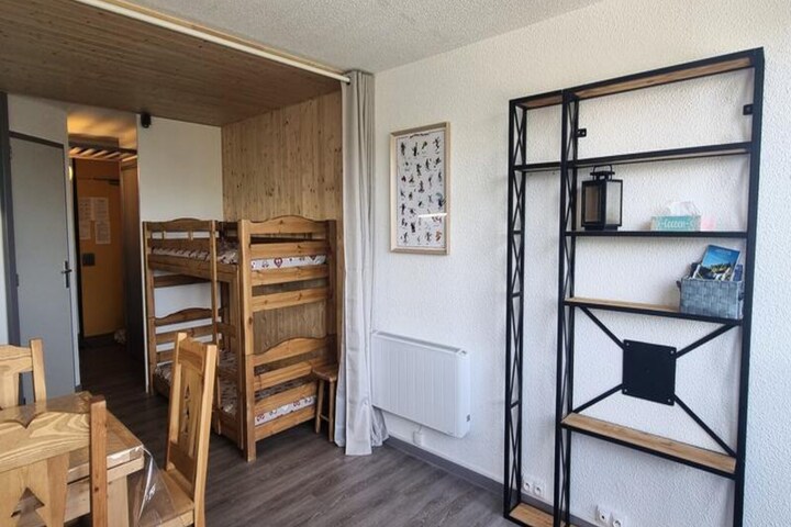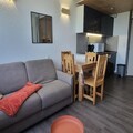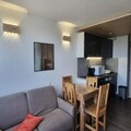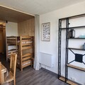 This recently renovated 26m² divisible studio is thoughtfully designed to accommodate up to four guests. The living area features a Rapido sofa bed, two cozy bunk beds, and a flat-screen television, ensuring comfort and relaxation after a day on the slopes. A fully equipped open-plan kitchen, complete with ceramic hobs, a refrigerator, and a selection of coffee makers, invites you to prepare delightful meals. The bathroom includes a bathtub, while the separate toilet adds to the convenience. Step out onto the north-facing balcony to soak in breathtaking views of Mont Blanc – a perfect backdrop for your morning coffee or evening reflection.