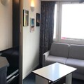 The 26m² studio is thoughtfully designed to maximize comfort and functionality. The living area features two single beds and a double sofa bed, providing flexible sleeping arrangements for up to four guests. A well-equipped open-plan kitchen includes a mini oven, microwave, electric burners, refrigerator, and even a raclette grill for cozy evenings in. The north-facing balcony offers a stunning view of Mont Blanc, inviting you to savor your morning coffee or unwind after an active day. Additional amenities include a flat-screen TV, a bathroom with a bathtub, and a separate toilet for added convenience.