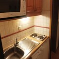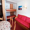 Designed to comfortably accommodate up to four guests, the studio is thoughtfully equipped with everything you need for a cozy alpine retreat. The living area features a trundle bed and bunk beds, making it ideal for families or small groups. The kitchenette includes a ceramic hob, refrigerator, microwave, and dishwasher, allowing you to prepare hearty meals after a day on the slopes. A flat-screen TV and duvets add to the comfort, while the bathroom provides a bathtub for a relaxing soak. For added ease, the residence includes individual ski lockers and elevator access to the 8th floor.