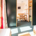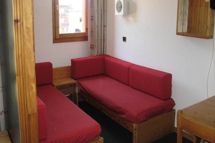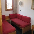 The studio, located on the second floor of the Pentes aux Coches residence, is thoughtfully designed to maximize comfort and functionality. The space features a fully renovated kitchenette equipped with a ceramic hob, oven, microwave, dishwasher, coffee maker, and a compact refrigerator—perfect for preparing hearty meals after a day on the slopes. The living area includes two single sofa beds, while a sliding partition allows you to create a separate sleeping space with two additional single beds. A flat-screen TV, a bathroom with a bathtub, and a separate toilet complete the amenities, ensuring a relaxing stay.