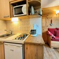Compact yet thoughtfully designed, the 20m² apartment comfortably accommodates up to four guests. The living room features a TV, a single bed, and a trundle bed, while a separate sleeping area with bunk beds ensures privacy and comfort. The kitchen is equipped with all essentials, including a combi oven, electric hob, and refrigerator, making it easy to prepare meals after a day on the slopes. Additional conveniences like a ski locker and optional services such as bed linen and towel delivery enhance your stay.