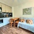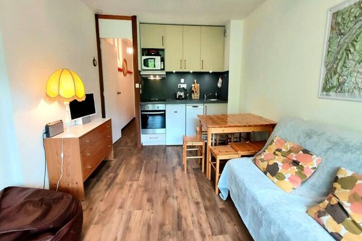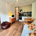 Step inside to discover a bright and welcoming living space, complete with a double sofa bed and a cozy atmosphere perfect for relaxing evenings. The newly renovated kitchen is fully equipped with modern appliances, including a ceramic hob, oven, microwave, and even a raclette grill for an authentic mountain dining experience. The bedroom features comfortable bunk beds and ample storage, while the updated bathroom offers a bathtub for a soothing soak after a day on the slopes. Additional conveniences like a ski locker and free parking right outside the residence make your stay hassle-free.