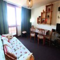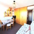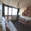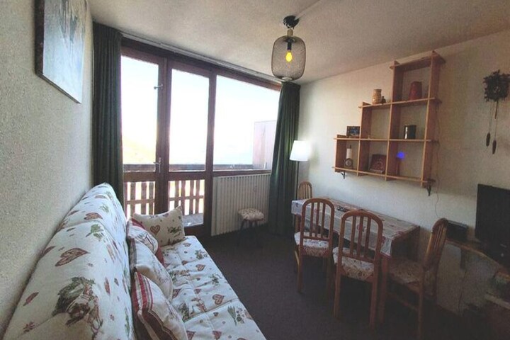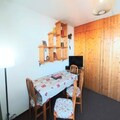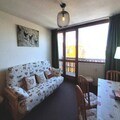 Inside, the apartment is thoughtfully designed to maximize comfort and functionality. The living room features a comfortable sofa bed (140x190) and a TV, creating a welcoming space to relax. The entrance hall includes practical bunk beds (80x190), while the separate kitchen is fully equipped with modern amenities such as a microwave, refrigerator, two coffee makers (KRUPS and Italian), an electric oven, ceramic hobs, and even a raclette grill for authentic alpine dining. The bathroom includes a bathtub and toilet, ensuring a refreshing end to your day. A ski locker is also available for your convenience, and free parking is located just outside the residence.