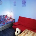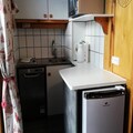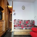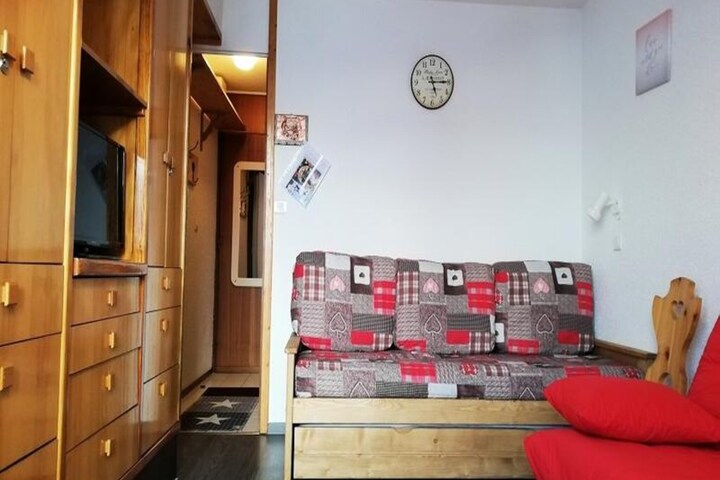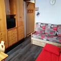 The studio, designed to accommodate up to four guests, is thoughtfully arranged for convenience and relaxation. The living area features a comfortable sofa bed and a television, creating a cozy space to relax after an active day. The compact yet well-equipped kitchen includes a mini oven, microwave, electric stovetop, refrigerator, and both a classic and Senseo coffee maker, making it easy to prepare meals and snacks. A private bathroom and toilet complete the amenities, while a ski locker ensures your gear is safely stored.
