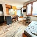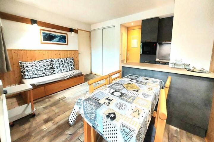 Designed to accommodate up to five guests, the 40m² apartment is thoughtfully laid out for comfort and functionality. The living room features a cozy sofa bed and trundle bed, perfect for relaxing evenings, while the spacious bedroom includes a comfortable double bed. The open-plan kitchen is fully equipped with modern amenities such as a ceramic hob, microwave, and dishwasher, ensuring you have everything you need to prepare delicious meals. A separate bathroom with a bathtub and a standalone toilet add to the convenience of your stay. Additional perks include a ski locker and a parking space in the covered lot, making your ski holiday hassle-free.