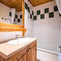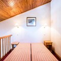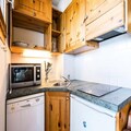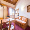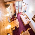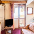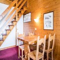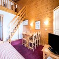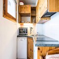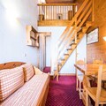 The apartment, designed for up to four guests, features a warm and functional layout. The living room includes a pull-out sofa bed for two, a flat-screen television, and an open-plan kitchen equipped with modern appliances such as a microwave, ceramic hob, refrigerator, dishwasher, and coffee maker. The mezzanine bedroom, accessible via a staircase, offers two single beds and ample storage space, creating a cozy and private sleeping area. A bathroom with a bathtub and a separate toilet ensure convenience, while additional amenities like a ski locker make this property ideal for ski enthusiasts.