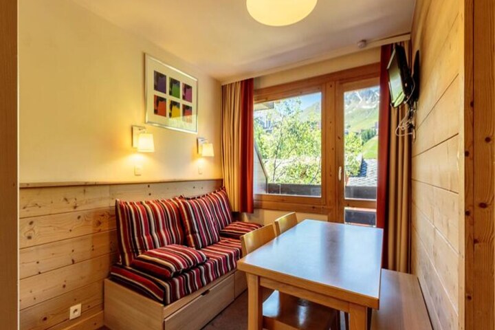 Guests have access to a heated outdoor swimming pool, a delightful perk for unwinding after a day on the slopes or exploring the surrounding trails. The residence’s chalet-style architecture adds a warm and inviting ambiance, enhancing your alpine retreat. Shops and essential amenities are conveniently nearby, and the Plagne Centre ski area is easily reachable via a bus service running until late at night.