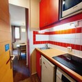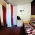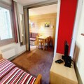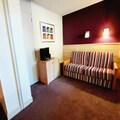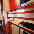 Inside, the apartment is thoughtfully designed for comfort and functionality. The living room, cleverly divided by a sliding partition, features a convertible sofa bed and a trundle bed, accommodating up to four guests. A fully equipped kitchen with modern appliances, including a microwave, refrigerator, dishwasher, and ceramic hob, ensures you have everything needed to prepare hearty meals. The bathroom includes a bathtub for a soothing soak, while a separate toilet adds convenience. Additional amenities such as a ski locker and access to a heated outdoor swimming pool (seasonal) enhance your stay.