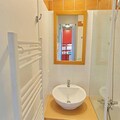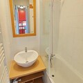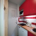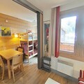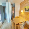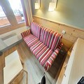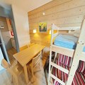 Step inside to discover a bright and inviting living space cleverly divided by a sliding partition. The seating area features a comfortable sofa bed and television, while the sleeping nook is equipped with a bunk bed, making it ideal for up to four guests. The fully equipped kitchen includes everything you need for home-cooked meals, from a microwave to a coffee maker, while the bathroom offers a relaxing bathtub to unwind after a day on the slopes. Separate restrooms and included Wi-Fi add to the convenience. A ski locker at the entrance and a nearby covered parking space ensure hassle-free logistics for your stay.
