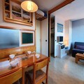 Inside, the studio is thoughtfully designed with a movable partition to create flexible spaces. The living room features a sofa bed and a dining area with two single beds, complemented by amenities such as a TV, stereo system, and DVD player. The separate kitchenette is fully equipped with modern conveniences, including a combination oven, microwave, ceramic hobs, refrigerator, and two coffee makers for your morning brew. A bathroom and separate toilet add to the practicality, while duvets ensure cozy nights. Non-smoking and pet-friendly, this apartment caters to diverse needs.