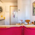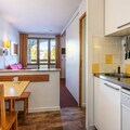 Inside, the apartment is thoughtfully designed to maximize space and comfort. The living room features two single beds and a television, while the separate bedroom with a movable partition offers a double bed for restful nights. The kitchenette is fully equipped with modern appliances, including a microwave/grill, dishwasher, induction hobs, refrigerator, kettle, coffee maker, and a Nespresso machine, ensuring you have everything needed to prepare delicious meals after a day of adventure. The bathroom includes a toilet, and the apartment is equipped with cozy duvets for added warmth. Please note that this is a non-smoking property, and pets are not allowed.