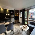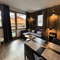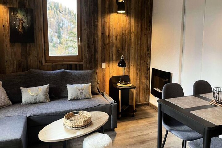 The apartment has been thoughtfully renovated, blending contemporary design with cozy alpine charm. It comfortably accommodates up to six guests, featuring a living room with a sofa bed and a television, as well as a bedroom with double bunk beds that provide a snug retreat. The open kitchen is fully equipped with modern appliances, including a refrigerator, ceramic hob, microwave, and even a raclette grill for a true taste of the Alps. Additional amenities such as a ski locker and covered parking ensure a hassle-free stay.