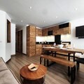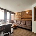 Spanning 60m², this high-end apartment comfortably accommodates up to six guests. The thoughtfully designed layout includes two cozy bedrooms and two modern bathrooms. The master bedroom features a plush double bed and an en-suite bathroom, while the second bedroom, overlooking the living area, offers four bunk beds, perfect for families or groups of friends. The open-plan kitchen is fully equipped with ceramic hobs, an oven, a microwave, a refrigerator, and a dishwasher, making it easy to prepare hearty meals after a day on the slopes. The living room, with its comfortable sofa bed and flat-screen TV, provides the perfect space to unwind. Additional conveniences include a wall-mounted ski boot dryer, Wi-Fi, and a washing machine with a tumble dryer.