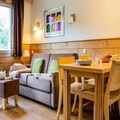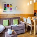 The residence itself is thoughtfully designed for comfort and convenience. Accommodations include a cozy living room with a double sofa bed, a well-equipped kitchenette, and a sleeping area with bunk beds ideal for children. Modern amenities such as bed and bath linens, ski lockers, and optional baby kits ensure a hassle-free stay. After a day of exhilarating activities, unwind in the warmth of your apartment or explore the resort's Deep Nature® spa, a 1,500 m² haven of relaxation offering indulgent beauty treatments and rituals.