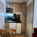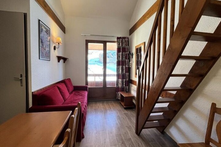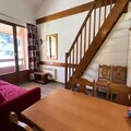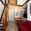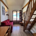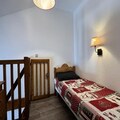 The apartment spans 39m² and comfortably accommodates up to six guests. Its bright living room features a cozy double sofa bed and a television, perfect for unwinding after a day on the slopes. The well-equipped kitchen includes a dishwasher, microwave, ceramic hob, and refrigerator, making meal preparation a breeze. The sleeping arrangements are thoughtfully designed, with a single bed in the first bedroom, a double and single bed in the upstairs second bedroom, and an additional single bed on the mezzanine. A bathroom with a bathtub and a separate toilet add to the convenience. Modern amenities such as WiFi, a ski locker, and a travel cot ensure a comfortable and hassle-free stay.