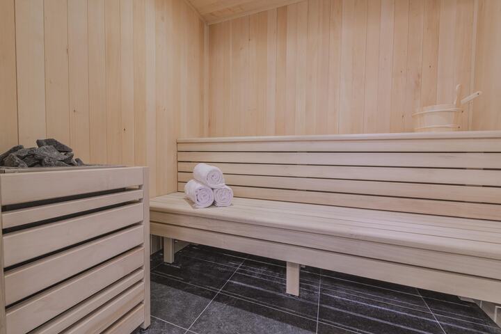 Living room(double sofa bed, TV(flatscreen), seating area), open kitchen(hob(ceramic), electric kettle, toaster, coffee machine, microwave, dishwasher, fridge, dishes and cutlery, Cooking basics), bedroom(double bed(160 x 200 cm)), bedroom(single bed, single bed), bathroom(shower, toilet), toilet(toilet), playroom, Internet access, Parking, cot, sauna, balcony or terrace, high chair