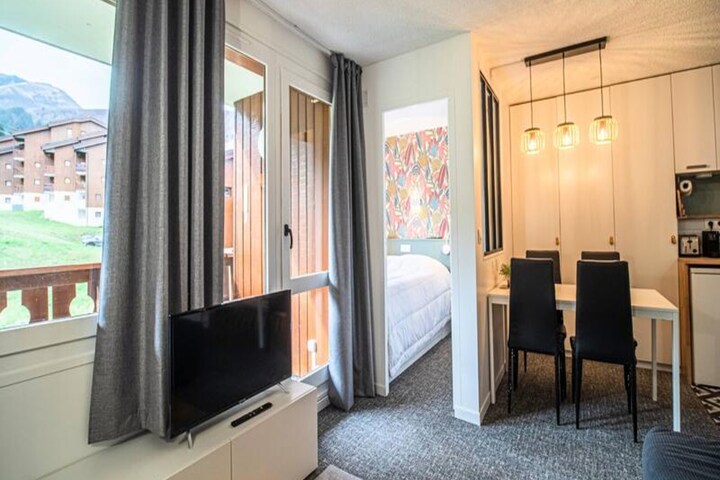 This newly renovated studio apartment is designed for comfort and relaxation, featuring a 140x190cm double sofa bed in the living room, as well as a separate bedroom with a double bed (140x200cm). The apartment is non-smoking and offers a south-facing balcony with stunning mountain views. It does not accept pets, ensuring a peaceful environment for all guests. Ski lockers are available for storing your gear, and a deposit is required at check-in for a hassle-free stay.
